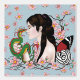 Een Aziatische fee die een nieuwe vriend maakt in een kleine groene Chinese draak in een achtergrond van roze kersenbloesems.