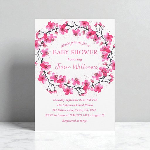 Kersenbloesem, sakura Waterverf bloemenillustratie baby shower uitnodiging. Mooie, handgeschilderde waterverf kunstwerk, ideaal voor uw Baby shower. Bloemontwerp. Personaliseer het met uw gegevens.