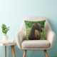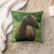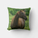 Foto van het kastanjepaard dat naar rechts kijkt tegen gras en bomen met een groene achtergrond en een kussen van kleur (aanpasbaar)/