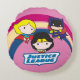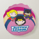 Bekijk Chibi Supergirl, Chibi Wonder Woman en Chibi Batgirl voor een regenboog die zich uitstrekt van een blauwe Justice League logo.
