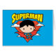 Kijk naar Chibi Superman die in de wolken vliegt met zijn superheldennaam overhead en rode polka stipschild achter hem.