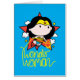Bekijk Chibi Wonder Woman dat in de wolken met haar lasso vliegt en haar naam met haar touw uitspant, tegen een rode sterrenachtergrond.
