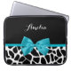 Een chique zwart-witte giraffe print 15'' laptop mouw met een trendy aqua blauw lint vastgebonden in een girly strik. Personaliseer dit schattige dierenprint ontwerp door jouw naam toe te voegen. Vlak gedrukt afbeelding, niet daadwerkelijke boog.