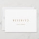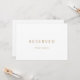 Dit gereserveerde teken voor chic gold is perfect voor een moderne bruiloft. De kaart is dubbelzijdig (prints aan beide zijden). Het eenvoudige ontwerp is voorzien van klassiek minimalistisch goud en witte typografie met een roestachtig boho-gevoel. in elke kleur. Houd het ontwerp minimaal en elegant, zoals het is, of personaliseer het door uw eigen grafiek en kunstwerk toe te voegen. Gebruik deze kaarten om stoelen of tafels te reserveren bij uw trouwceremonie, ontvangst of om het even welke gebeurtenis.