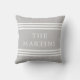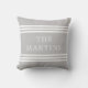 Deze eenvoudige en elegante kussen bieden een zachte grijze achtergrond met stijlvolle witte strepen en uw familienaam in het midden.