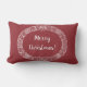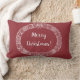 Een feestelijke lumbar Pillow of Cushion met een kerstgeschreeuw van heilig, ivoren, poinsettias, vuurkeien en kruiwagens van vuurboom. Deze met de hand getekende kerstman is wit op een dieprode achtergrond, met 'prettige kerst' in decoratieve letters, ook in het wit.