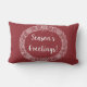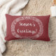 Een feestelijke Lumbar Pillow of Cushion met een kerstkreet vol heilig, ivoren, poinsettias, vuurkeien en kruiwagens van een boom. Deze handgetekende kerstman is wit op een dieprode achtergrond, met 'Seizoensgroeten' in decoratieve letters, ook in het Wit.