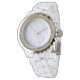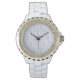 Een chique wit emaille Rhinestone polshorloge, met een patroon van helderblauwe maagdenpalmbloemcontouren, in een diamantvorm op een witte achtergrond. Onderdeel van het Posh en Painterly 'Periwinkle Patch' collectie, dit patroon kan gemakkelijk worden aangepast aan elk polshorloge.