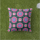Levendig ontwerp van kussen voor gebruik buitenshuis met een naadloos patroon, bestaande uit geometrische vormen in roze, blauw, zwart en wit.