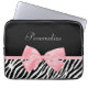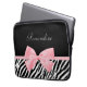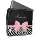 Met deze stijlvolle, stijlvolle 13-inch laptophoes van 13 inch kunt u uw fashionista aan. Deze mode accessoire heeft een trendy zwarte en witte zebraafdruk en een zacht vrouwelijk lichtroze lint gebonden aan een schattige meisjes buiging. Personaliseer je door de naam van je tienermeisje toe te voegen. Vlak gedrukt afbeelding, geen echt lint. Origineel Kunstauteursrecht ©OhSoGirly