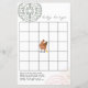 Baby bingo met richtingen bovenaan en met 5x5 vierkantjes en vervolgens met een baby klok in het midden met boho-design in hoeken. Baby-kuiken draagt een roze boog.