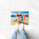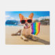 Op deze schattige foto staat een chihuahua-hond op het strand met een regenboogkleurige Gay Pride vlag.