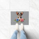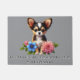 Illustratie van een Chihuahua-puppy met lange haren in drie kleuren, zittend met levendige bloemen, die onschuld en schoonheid uitbeeldt, met de nadruk op harmonie en schattigheid.
