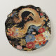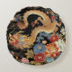 Dit ronde kussen heeft een Aziatische stijl draak en pioenbloemen op een zwarte achtergrond.