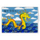 Chinees dragon Boat Festival/Duanwu Festival, papieren wenskaart. Een Chinese draak die op golven drijft, staat op de cover van het Happy Dragon Boat Festival, het papieren wenskaart. Bericht op de cover geschreven in het Chinees (duanwu jie kuaile) Happy Dragon Boat Festival! Het binnenste bericht bevat een Chinees spreekwoord. Kunst, afbeelding en vers copyright © Shoaff Ballanger Studios.