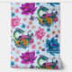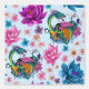 Een Chinees groen en paarse waterdraak met een oranje koi vis, lotusbloemen en kersenbloesems allemaal in water in een achtergrond van blauw.