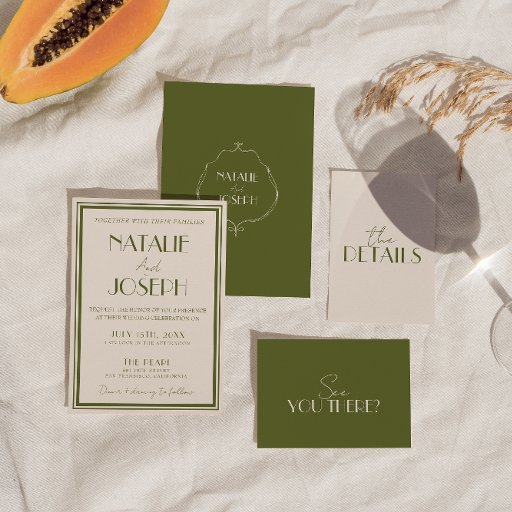 Deze trouwuitnodiging is perfect voor je bruiloft als je op zoek bent naar een elegante, unieke en gemakkelijk bewerkbare QR-code foto-uitnodiging. Een elegante, unieke, luxueuze olijfgroene en ivoorkleurige afbeelding trouwtemplate uitnodiging. Zoals je ziet heeft deze een effen crèmekleurige achtergrond. En klassiek Parijs lettertype in olijfgroen, helder bruid- en bruidegom-voornaam en script info. Met olijfgroene achtergrond aan de achterkant en klassieke rand met bruid- en bruidegomnamen. En aanpasbare foto en scanbare QR-code aan de achterkant. Het is betaalbaar en het is ook een digitale, elektronische e-uitnodiging als je deze per sms of e-mail wilt versturen. Alle informatie is aanpasbaar door op de personaliseerknop te klikken