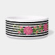 Chique witte keramische huisdier voedsel / water kom, met afbeeldingen van een zwart en wit horizontale streep patroon. Afbeeldingen van een band van roze rozen, loopt over het midden en een decoratief tekstgebied, aan de voorkant, heeft zwarte tekst klaar om te personaliseren, voor uw huisdier of als een geweldig cadeau-idee voor elke huisdiereneigenaar. Bijpassend dierenbed beschikbaar.