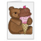 Een schattige teddybeer zit vast en kleeft aan zijn reusachtige ijskegel met een chocolade-ijsje en een stroop aardbei.