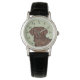 Destei's originele cartoon-illustratie van een chocoladebruine kleur Labrador Retriever fokt het hoofd van de hond. De achtergrondkleur is groen met een decoratieve textuur. De textuur kan worden verwijderd en de achtergrondkleur kan worden gewijzigd in een andere kleur, indien gewenst. De uren zijn gemarkeerd met cijfers. De uren en minuten worden getoond met een gestippelde wijzerplaat.