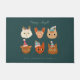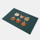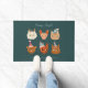 Grappige en leuke kerstdeurmat met handgetekende illustratie van schattige katjes die winterse accessoires dragen. De achtergrond is groen.