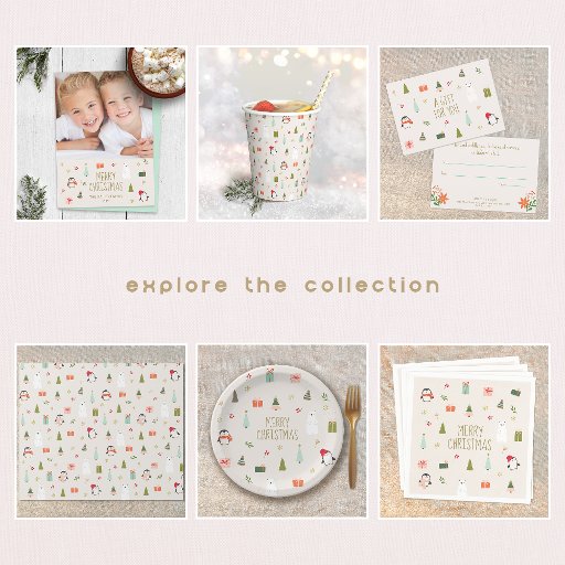Leuke kerstcadeaubon met symbolen van de feestdagen zoals kerstbomen, pinguïns, cadeaus en hulst.