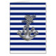 Een zilverkleurig chroomachtig anker met touwontwerp op een decor met marineblauwe strepen. Een modern nautisch geschenk.