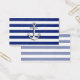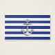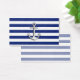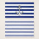 Een zilveren chroomachtige ankerappliqué op een horizontale marineblauwe strepenprint decor voor een perfecte nautische look.