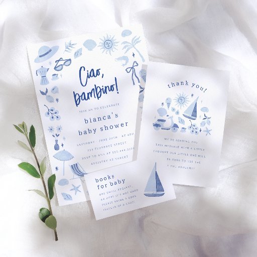 Ciao baby! This blue baby shower invitation features a frame of watercolor Italian summer elements. The hand-painted frame includes lemons, tomatoes, seashells, starfish, a Vespa, a hat and sunglasses, a sailboat, gelato, a beach umbrella, and other Mediterranean illustrations. Ideal for an Italian-themed summer baby shower. Cards reverse to a pattern of vintage stripes in navy blue against a baby blue background. As part of Zazzle's budget selection, this sheet doesn't come in standard card sizes. To get this design on a standard card, you can find it in the collection or use the Zazzle Make Machine to transfer it onto your preferred product. Matching items are available in the collection linked on this page. Browse our store for more baby shower invitations.