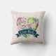Een kussen met aanpasbare tekst waarin staat: "Ciao Bella" in gekromde tekst in een blauw groen lintje dat boven op een wit hart staat gevuld met tropische bloemen en bladeren in roze, groene en gele kleuren. De achtergrond is een gevlekt patroon met cirkels in lichtroze en wit. Summery en grillig ontwerp met een flair.