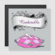 Een sjabloon van de douanemagneet met paarse manuscriptbrieven op een banner, met het etsen van de glazen slipper van Assepoester op een roze kussen.