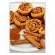 kaneel in poedervorm en stok met freah gebakken minikaneelrollen op een wit bord