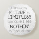 Een wit rond kussen met het grappige citaat "Ik weet dat mijn TOEKOMST GRENZELOOS is omdat ik NIETS voor me kan zien".