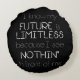 Een ronde zwarte kussen met het citaat "Ik weet dat mijn TOEKOMST LIMITLESS is omdat ik niets kan zien" voor me.