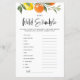Ontruim de woorden en wie de meest correcte wint! | Voeg deze leuke en speelse gamekaart toe aan uw evenement. Deze aanpasbare baby word scramble gamekaart biedt waterverf illustraties van citroenen en sinaasappels. Personaliseer u door uw vragen toe te voegen. Dit citrusbaby shower giscard is ideaal voor zomerfeesten en baby showers.