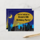 De zoeklichtbundels over de stad zoeken hulp om de mensen te redden van onrecht. Misschien zal de kleine Birthday Boy de superheld zijn om de dag te redden. Fun urban city skyline in night scene in blauw met gele maan, maakt een geweldig Birthday party-thema voor kinderen, vooral jongens die van superheldenthema's houden.