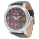 Stijlvol lederen bandhorloge, met het klassieke kleurrijke clan MacPherson tartan geruite patroon, op het gezicht, met witte cijfers en stippen voor de uren. Witte aangepaste tekst leest MacPherson, en kan worden gepersonaliseerd om te lezen wat je wilt.