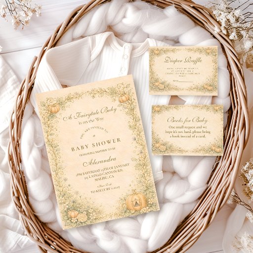A soft storybook-inspired baby shower collection with a timeless fairytale feel, featuring delicate vines, whimsical details, and a warm parchment background.