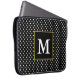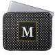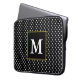 Een groot wit monogram is een zwart vierkant met een faux gouden grens. Witte polka stippen zijn op deze zwarte laptophoes.