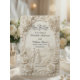 Evoke the grandeur of history with this faux bas-relief design featuring a classical romantic scene in monochromatic stone tones, perfect for formal cathedral ceremonies.This design utilizes a trompe-l'œil technique to simulate the appearance of a hand-carved limestone or plaster frieze. The composition leads the eye down a winding cobblestone path where a bride and groom, depicted in Grecian-draped silhouettes, walk toward a Gothic cathedral spire nestled among cypress trees and blooming rose bushes. The color palette is strictly monochromatic, utilizing shades of warm ivory, beige, and cool stone gray to enhance the depth of the digital shadows and highlights. The typography hierarchy balances elegant black calligraphy for names with traditional Roman serifs for the venue details, maintaining an organized, art-history-inspired layout.