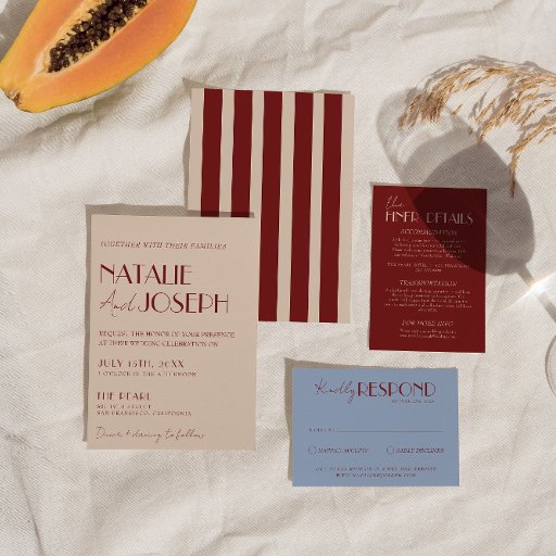 This wedding invitation is perfect for your wedding if you are looking for an elegant unique and easy editable invitation .An elegant unique simple minimalist deep red and cream wedding template invitation. as you see it features plain cream background. And classy Parisian font burgundy bright bride's and groom's first names and script info. With pinstripes background in cram and deep red .Affordable and it is also digital electronic e-invitation if you want to send it by text or email. All the info are customizable by clicking on the personalize button. So Grab it and make it yours so you make you invites engaged and excited .