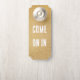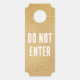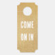 Gulden kleerhanger. Aan de ene kant staat "Niet binnenkomen" en aan de andere kant staat "Kom binnen". woorden indien nodig.