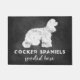 "Cocker Spaniels Spoiled here", een schattig Cocker Spaniel-silhouet en tekst die in een krijstijl op een zwarte-bordachtergrond wordt gemaakt.