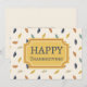 Thanksgiving wenskaart met de woorden "Happy Thanksgiving" op een achtergrond van kleurrijke valbladeren. Voeg je eigen bericht aan de achterkant toe.