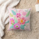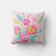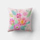 Dit kussen is voorzien van een vrouwelijk en mooi kleurrijk boeket van diverse bloemetjes in de tinten roze, sinaasappel, geel en wit, die worden aangevuld met groene en aqua bladeren op een zacht roze achtergrond.
