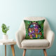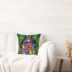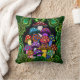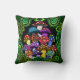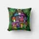 Een kussen met kleurrijke psychedelische paddenstoelen omgeven door groene paisley en groene mandala's.
