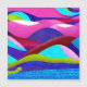 Kleurrijk abstract landschap van heuvels en een oceaan in kleuren van roze, paars, blauw, groen en cyaan.