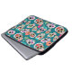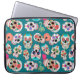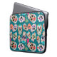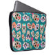 Heldere afbeeldingen suikerschedels maken een kleurrijk patroon op dit schattige en unieke computer sleeve. Er zijn tien verschillende schedel afbeeldingen, allemaal individueel in verschillende kleuren, en geplaatst op een complementaire blauwgroen achtergrond.