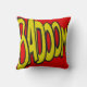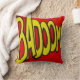 Op dit stripverhaal-geïnspireerde kussen het woord 'badoom'. wordt uitgepikt in helder geel boven een levendige rode achtergrond. Een subtiel mezzotint effect is de afwerkingslaag over het gehele stuk.