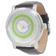 Een horlogezijde met een concentrische cirkelvormig ontwerp, waarin de stralen zijn aangebracht om de minuten en uren in de buitencirkel te markeren. Deze versie heeft een stevig gekleurde eerste binnencirkel en de tweede binnenring heeft minieme stralen. Alle stralen staan correct op en de uren zijn gemerkt met een bevochtigde lijn in de buitencirkel die zowel een decoratief als praktisch klokgezicht verstrekt.